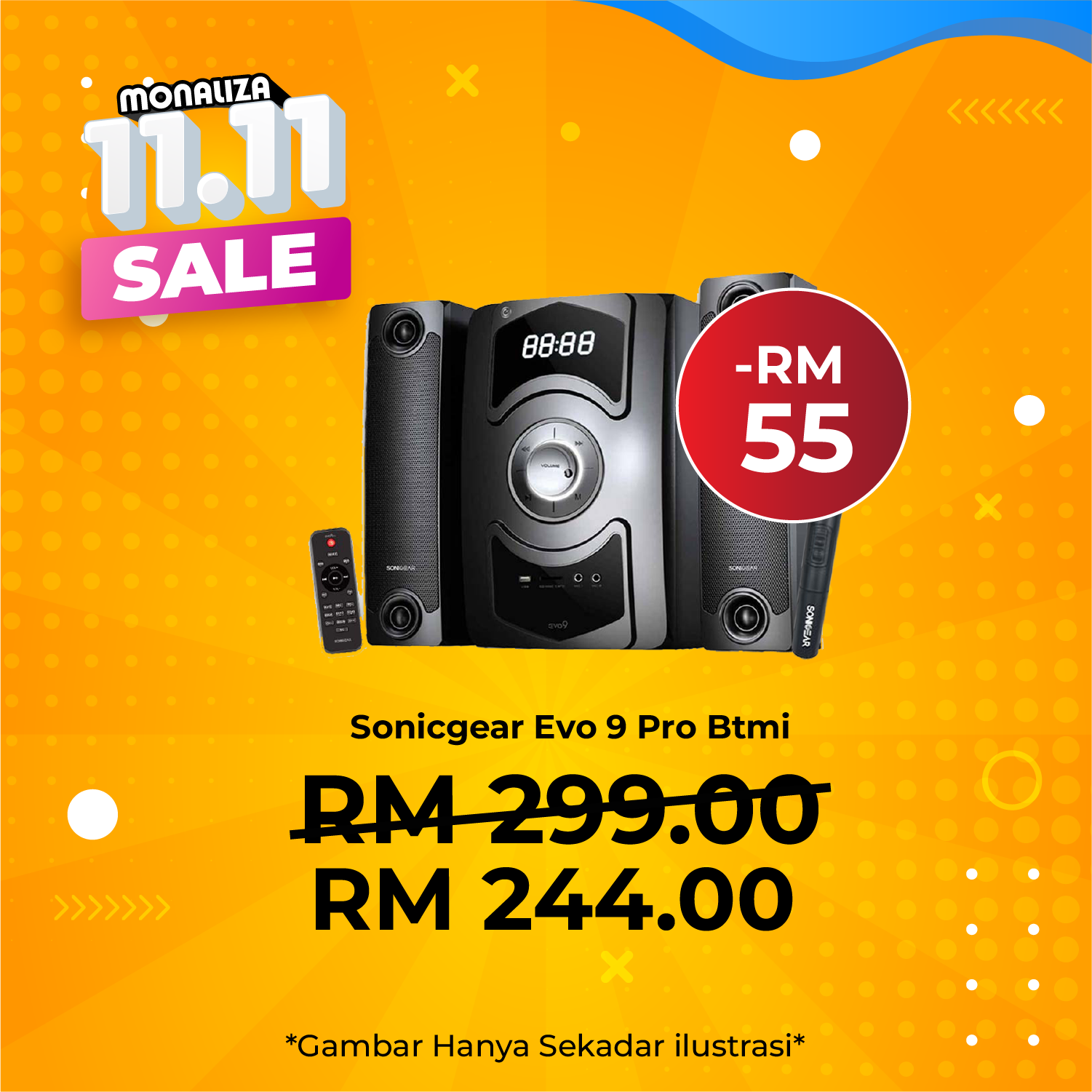 ![[ PROMOSI 11.11 ] SonicGear Evo 9 BTMI Bluetooth Multimedia Speaker (with Wireless Microphone) - Image 2](https://monaliza.com.my/wp-content/uploads/2025/10/APPWcYUu1627036347-1000x1000-1-285x285-1-1-optimized.jpeg)
